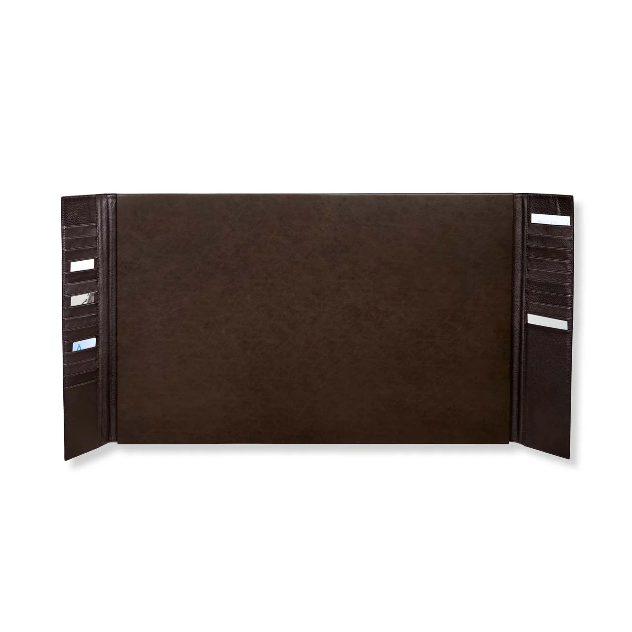 A durable desk mat, outfitted in our intrepid Bomber Jacket leather, reminiscent of the rugged leather used in the jackets of World War II fighter pilots. The fold-up wings on either side offer card storage underneath: the left side can hold 15 business cards, and the right side 10 3 x 5 index cards. The smooth writing surface can be used with or without a blotter or desk pad, and the felt bottom protects your desk.