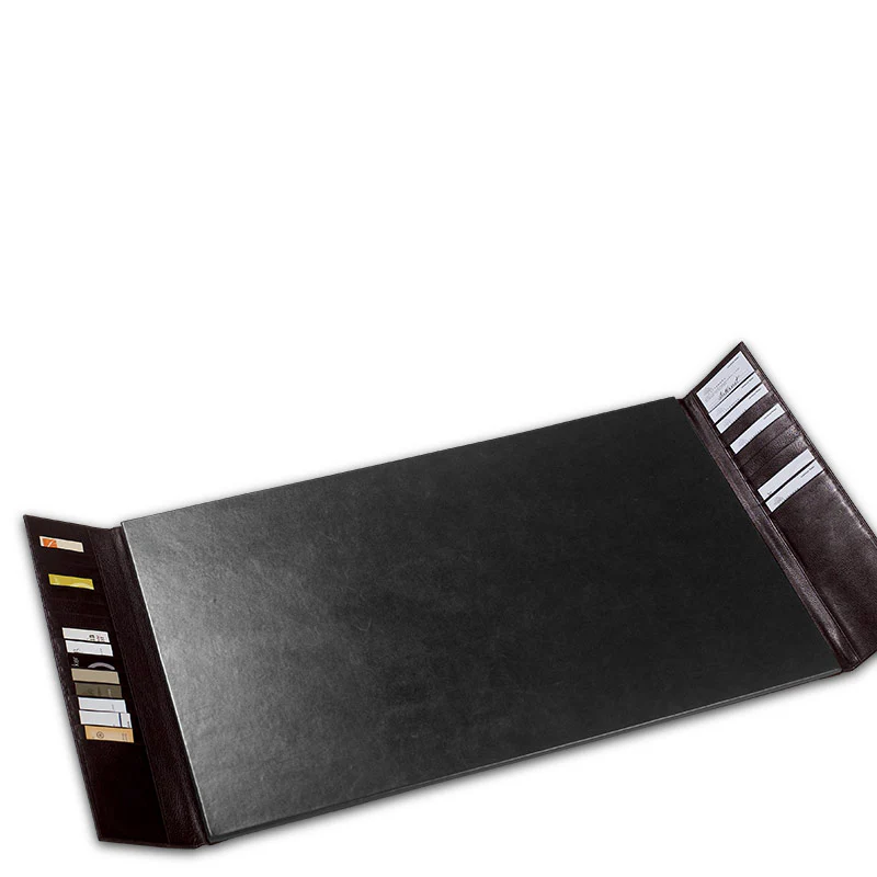 A distinctive desk mat for larger desks. Our Bomber Jacket leather makes durable deskware and helps keep your workspace beautifully organized. The fold-up wings on either side offer card storage underneath: the left side can hold 15 business cards, and the right side 10 3 x 5 index cards. The smooth writing surface can be used with or without blotter paper, and the felt bottom protects your desk.