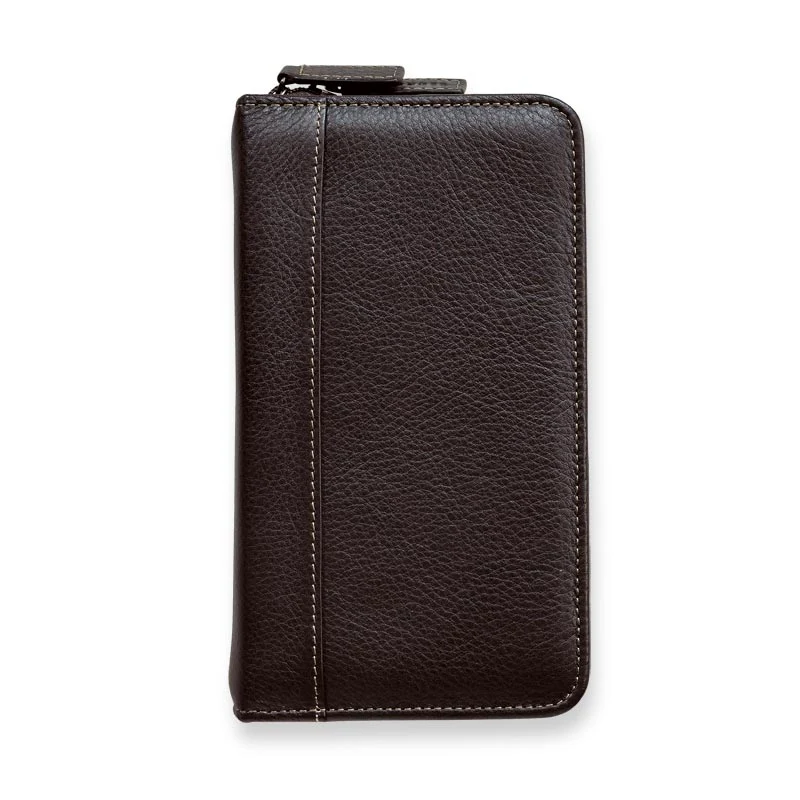 Take pens or small tools with you in this zip-secure case with built-in pouch, crafted in our pebbled, full-grain mocha leather with plaid twill lining. The attached zippered accessories pouch can hold ink refills, erasers or other small items. It holds up to seven instruments of varying sizes, each in their own sleeve.Â