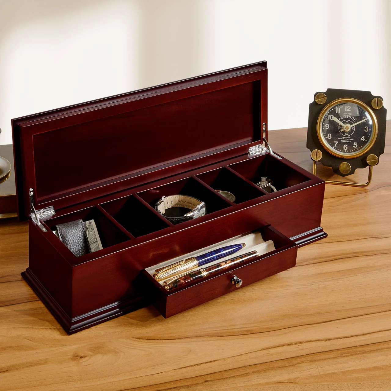 For practitioners in the art of writing. Store all of your fountain pen essentials in this elegant and streamlined atelier. It’s a fountain pen enthusiast’s dream: The drawer cradles and protects three pens. The included matching pen stand holds two more upright. (Pens available separately.)  Two of the four velvet-lined interior compartments are ideal to hold a Levenger ink bottle, while the other two can hold nibs, converters and cartridges. Personalize the lid with a monogram to make it your own.