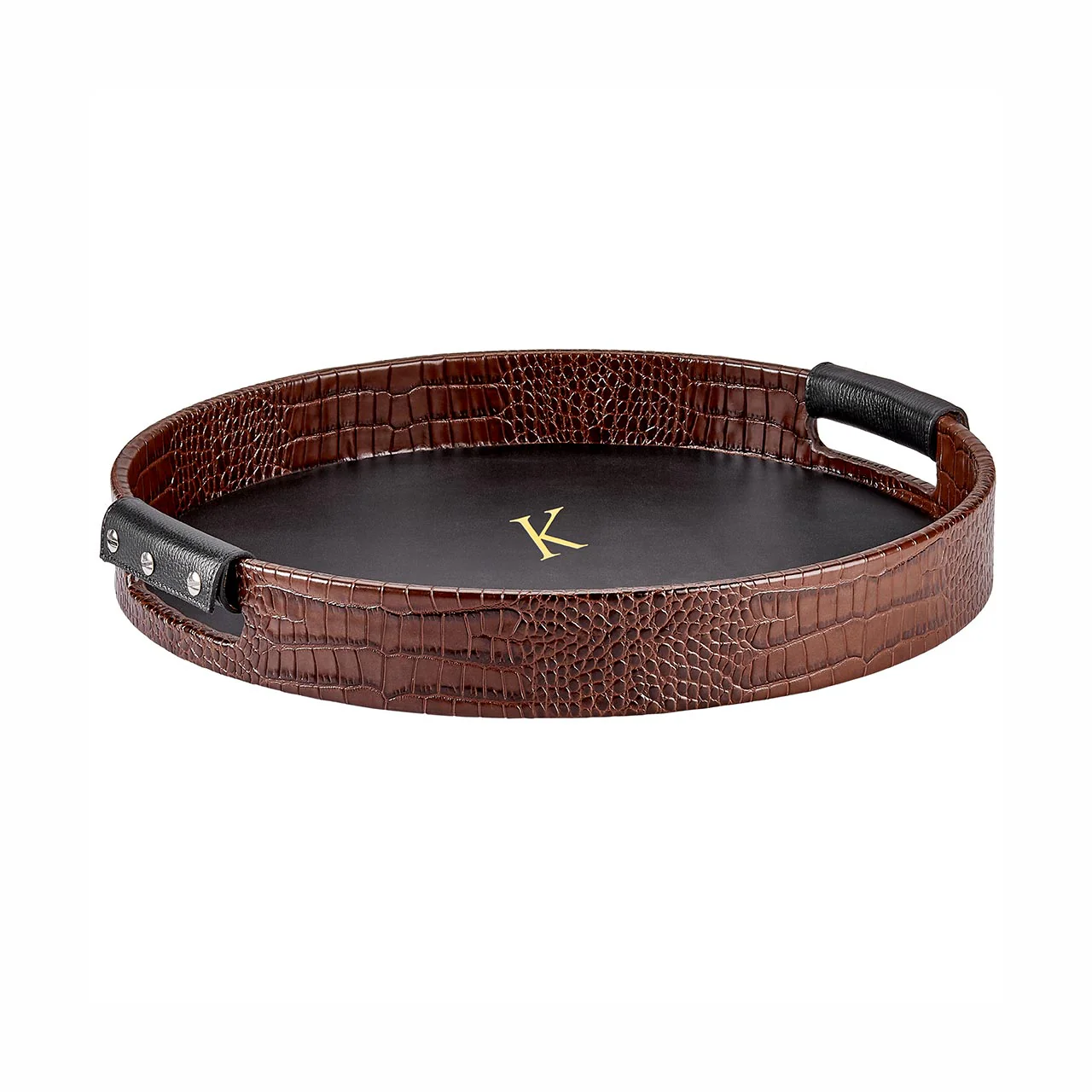 Tray chic! Finished in Italian embossed leather, with complementary interior leather bottom and leather handles, this 15" round tray serves up drinks or hors d’oeuvres in sleek, stylish fashion. Up to 3 initials of personalization in gold foil available. Handcrafted in the USA.