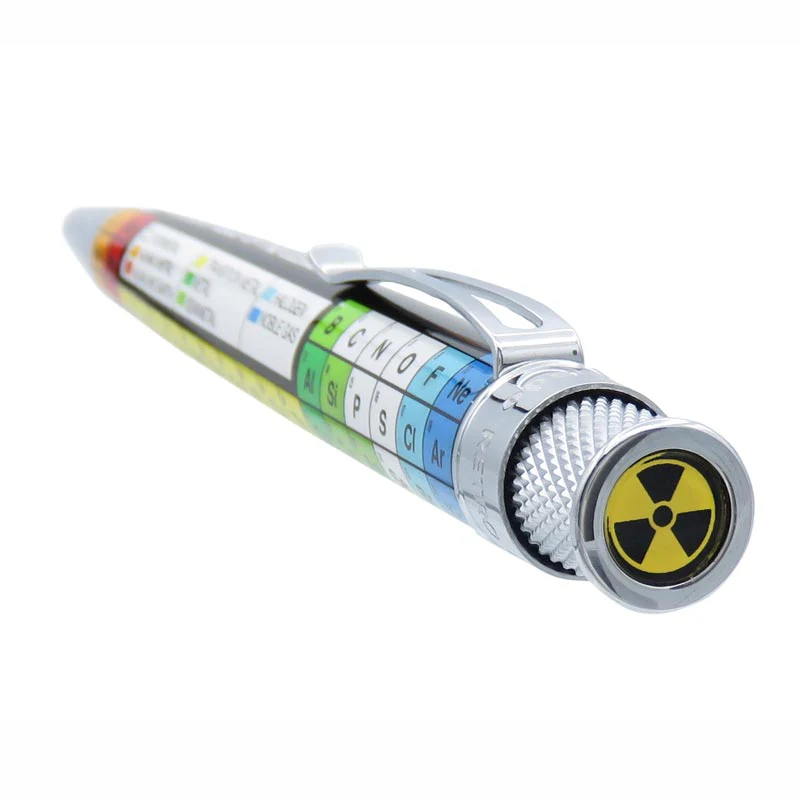 A rollerball pen designed for scientific minds. Curiosity and persistent research lead to revolutionary discoveries. Dmitri Mendeleev, Russian chemist and inventor, is known for formulating the Periodic Law and drafting a version of the Periodic Table of elements. This capless rollerball pen was inspired by the innovative Dmitri and his commitment to science, featuring the Periodic Table on a metal barrel, set off by chrome trim. The pen is packaged in a patterned tube, additionally illustrating all the scientific elements. The precise writing apparatus features Retro 51’s signature knurled twist top and can effortlessly convert to a ballpoint pen with a refill change.