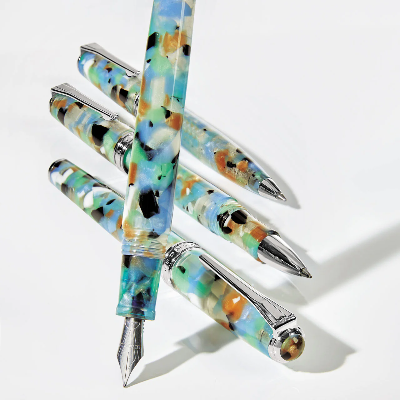 The award-winning True Writer® design returns. Customers have clamored for us to bring back this timeless True Writer pen. The Sea Glass Fountain Pen captures that childlike delight of finding those glistening pieces of sea glass on the beach. Green, blue and other gentle hues are offset by the shining chrome trim. As with all our True Writers®, this pen is perfectly weighted and balanced for a comfortable writing experience. Engraved stainless steel fountain pen nib made in Germany. All True Writer fountain pens have interchangeable nibs. Personalize it with a monogram or full name. Fine or Medium.Â